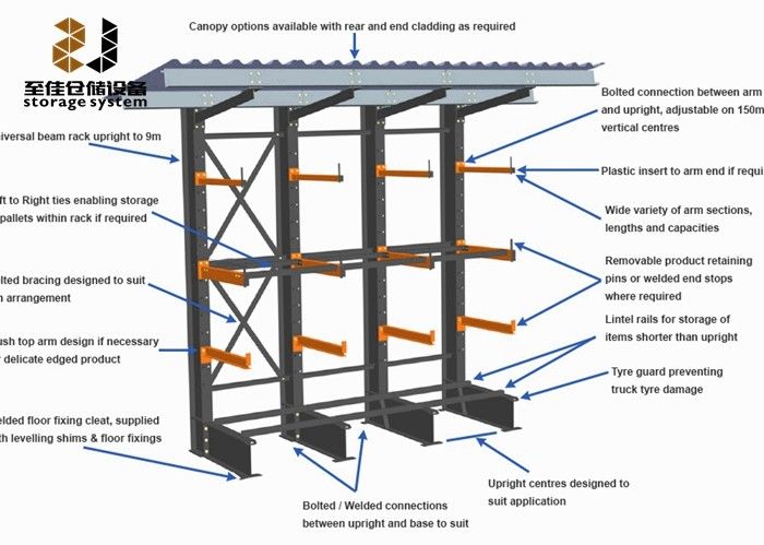* Cantilever racks có thể được sơn trong nhiều màu sắc khác nhau và có thể được thép cho các ứng dụng bên ngoài